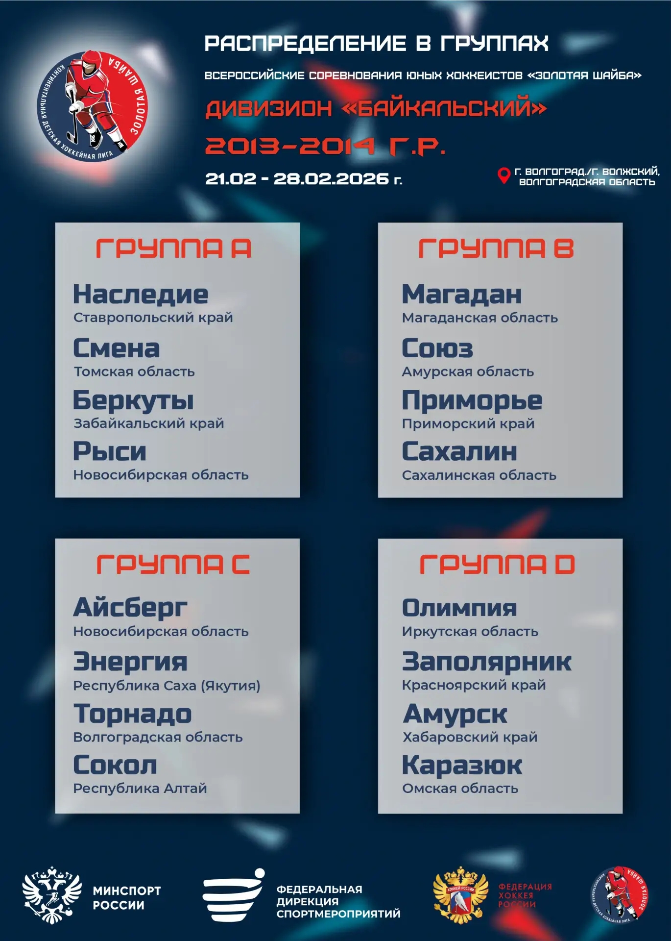 Распределение команд в группах на Всероссийских финальных соревнованиях юных хоккеистов «Золотая шайба» среди команд 2013-2014 г.р., дивизион «Байкальский»