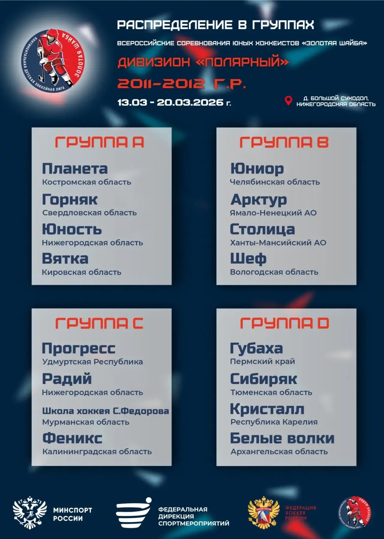 Распределение команд в группах на Всероссийских финальных соревнованиях юных хоккеистов «Золотая шайба» среди команд 2011-2012 г.р., дивизион «Полярный»