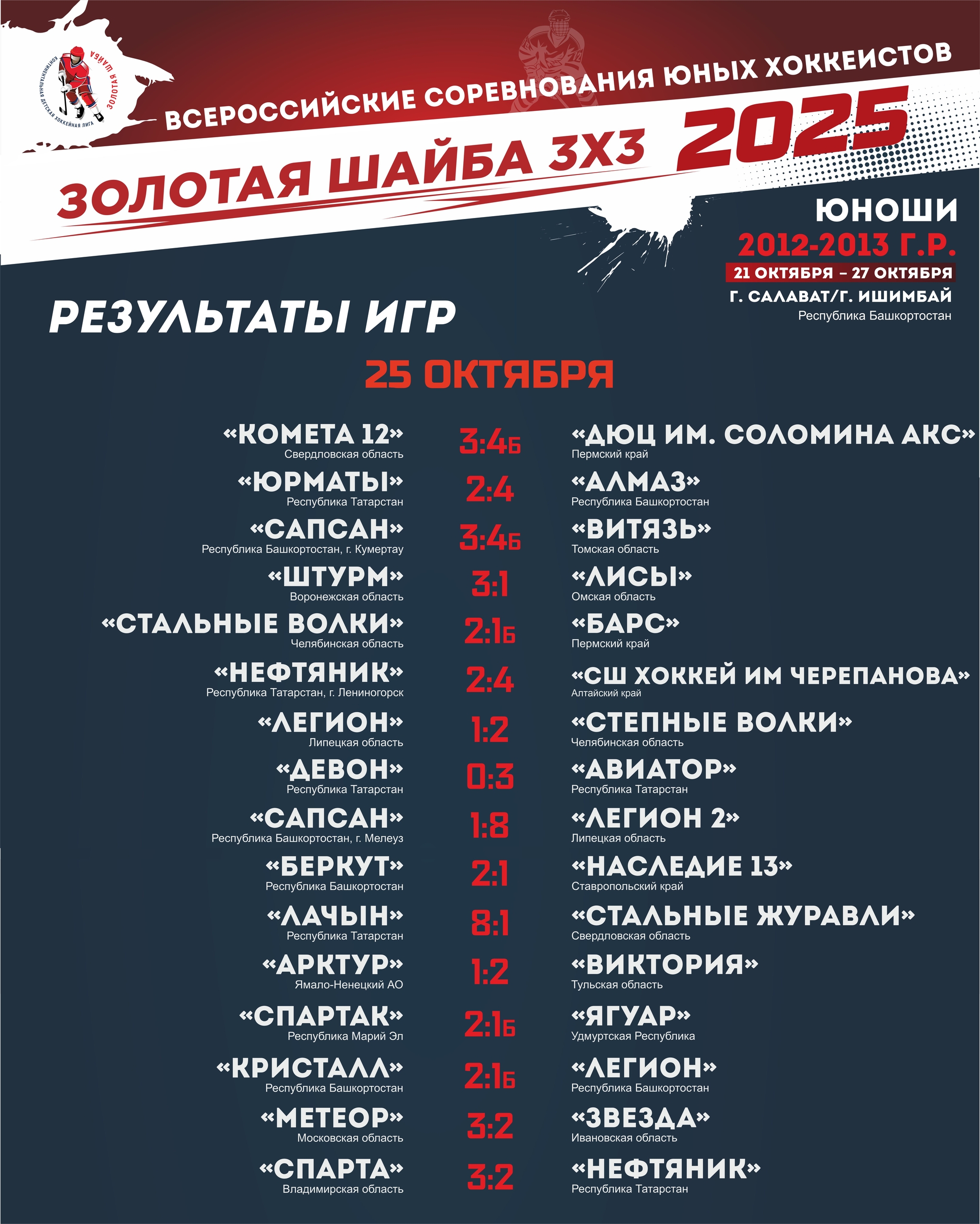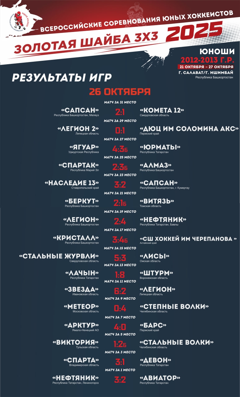 Сегодня на ледовых аренах Республики Башкортостан завершились захватывающие Всероссийские соревнования юных хоккеистов «Золотая Шайба 3х3» среди команд юношей 2012-2013 годов рождения! С 22 по 26 октября на льду кипели...