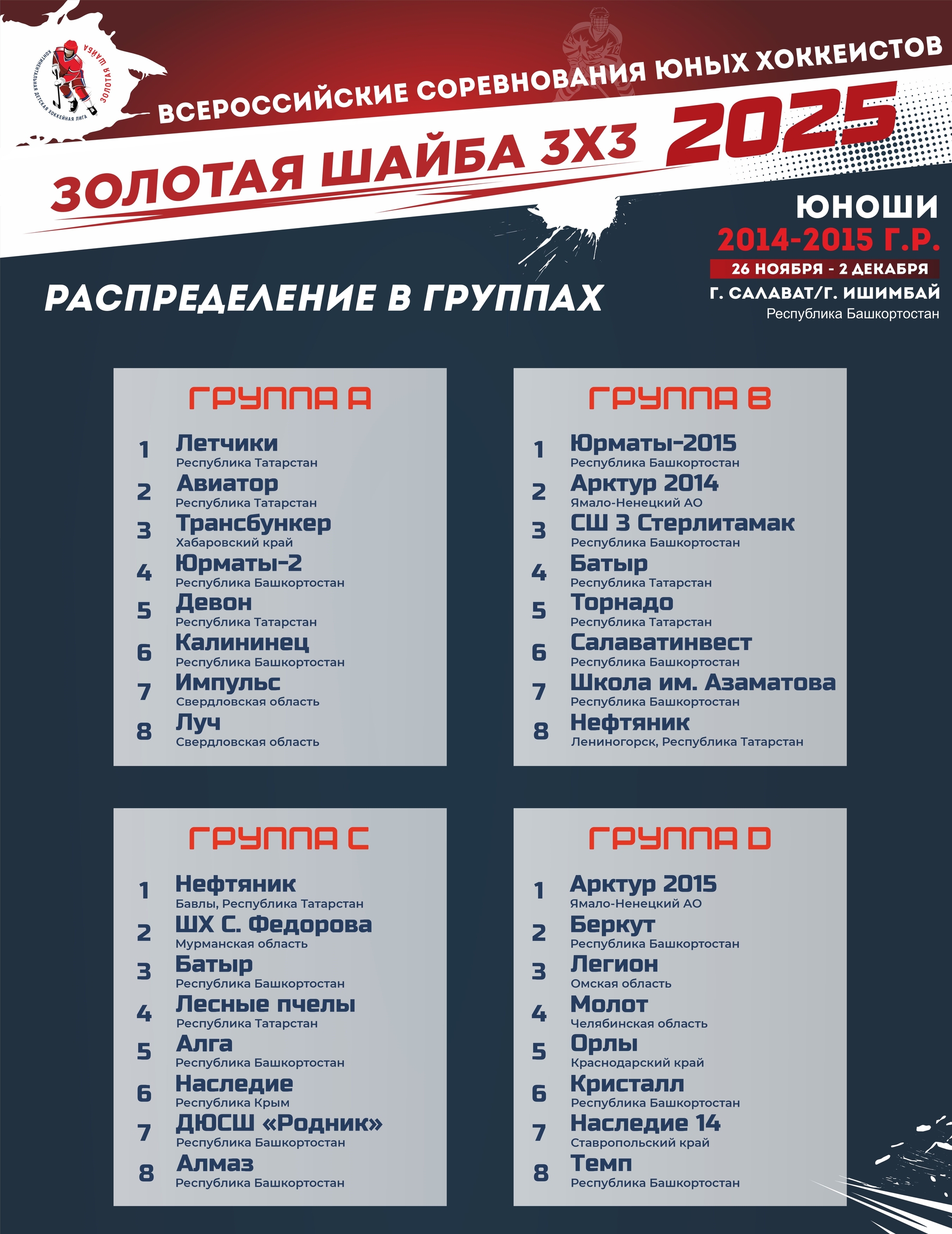 Распределение команд в группах на Всероссийских соревнованиях юных хоккеистов «Золотая шайба 3х3» среди команд 2014-2015 г.р., Республика Башкортостан