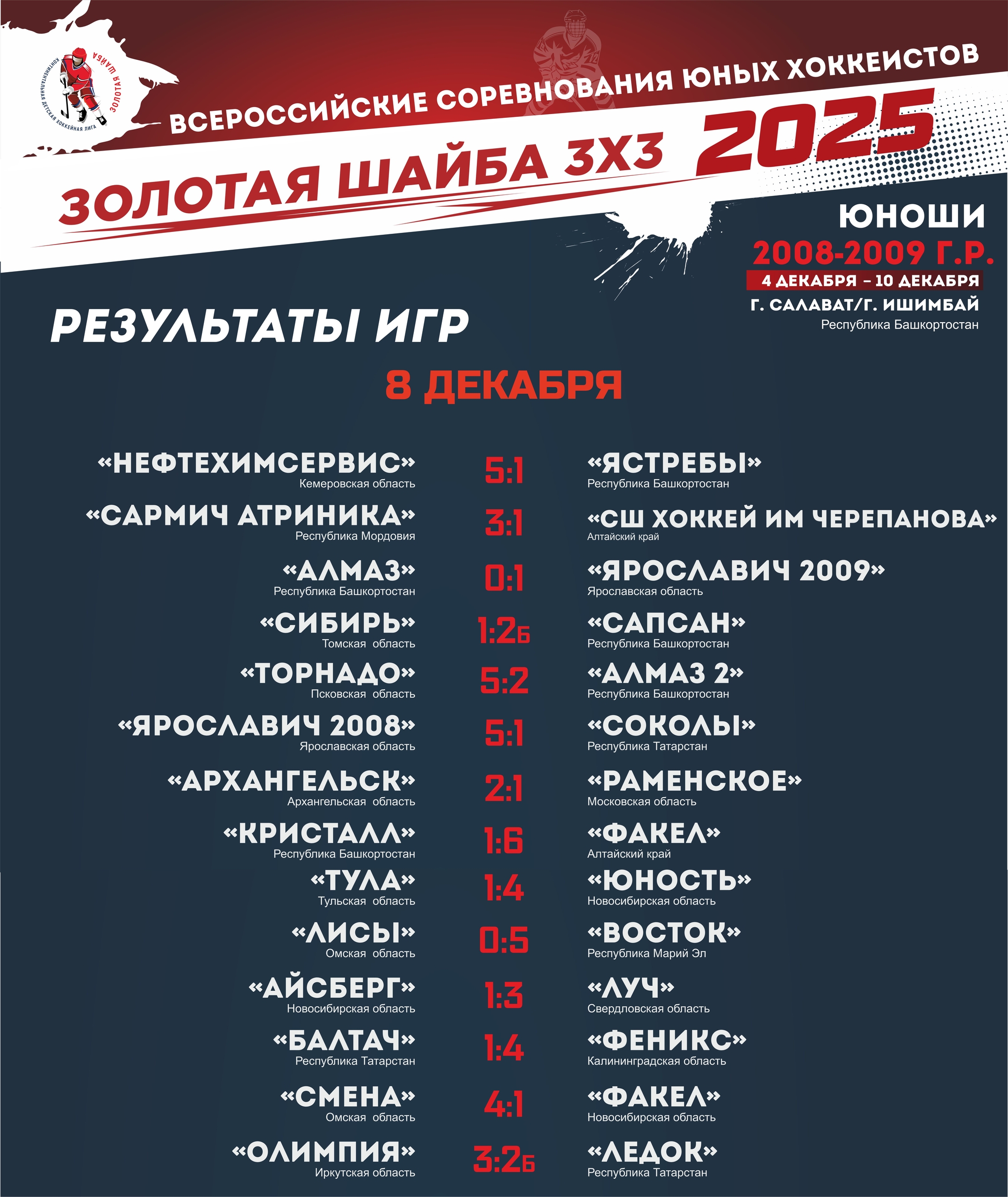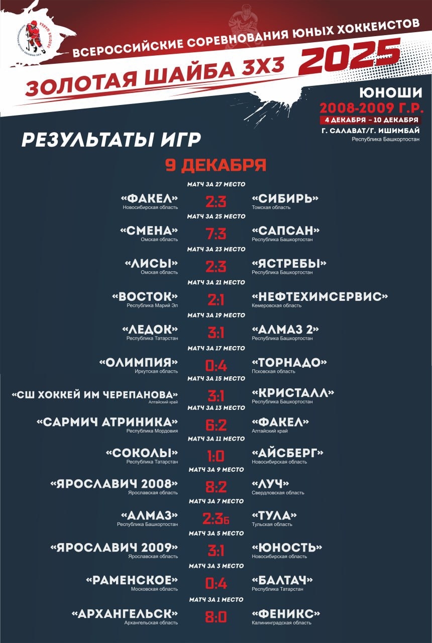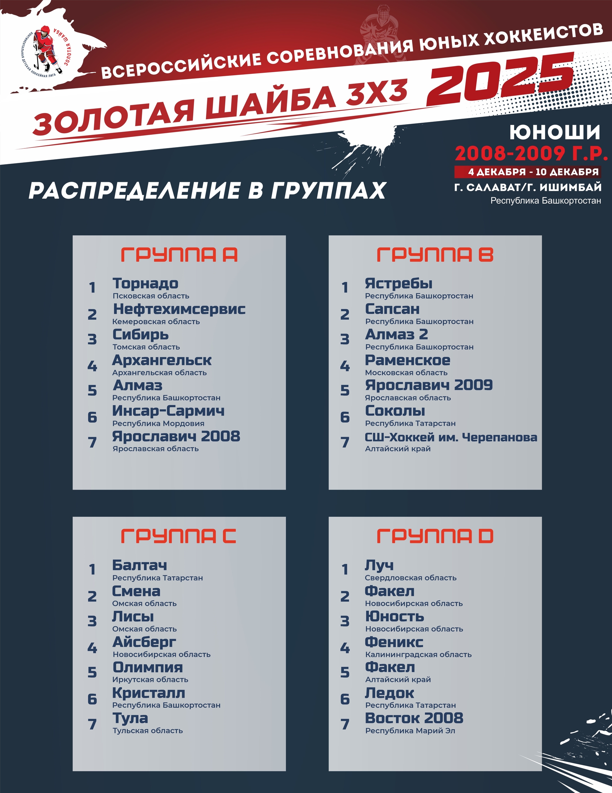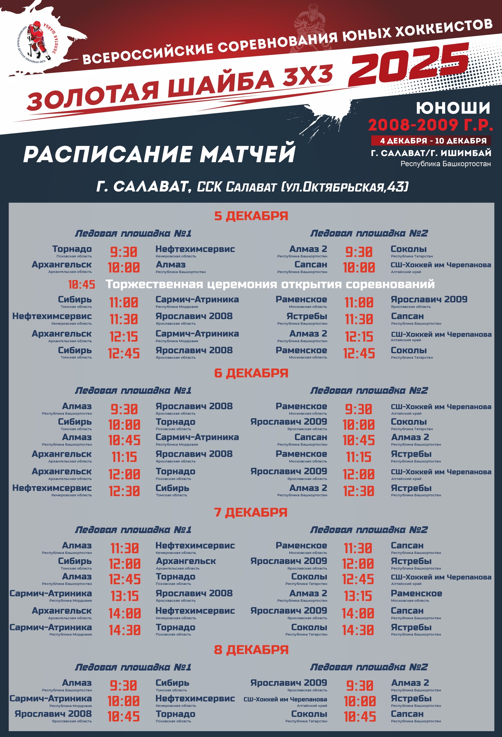 Расписание группового этапа Всероссийских соревнований юных хоккеистов «Золотая шайба 3х3» среди команд 2008-2009 годов рождения, которые пройдут в городах Салават и Ишимбай с 4 по 10 декабря