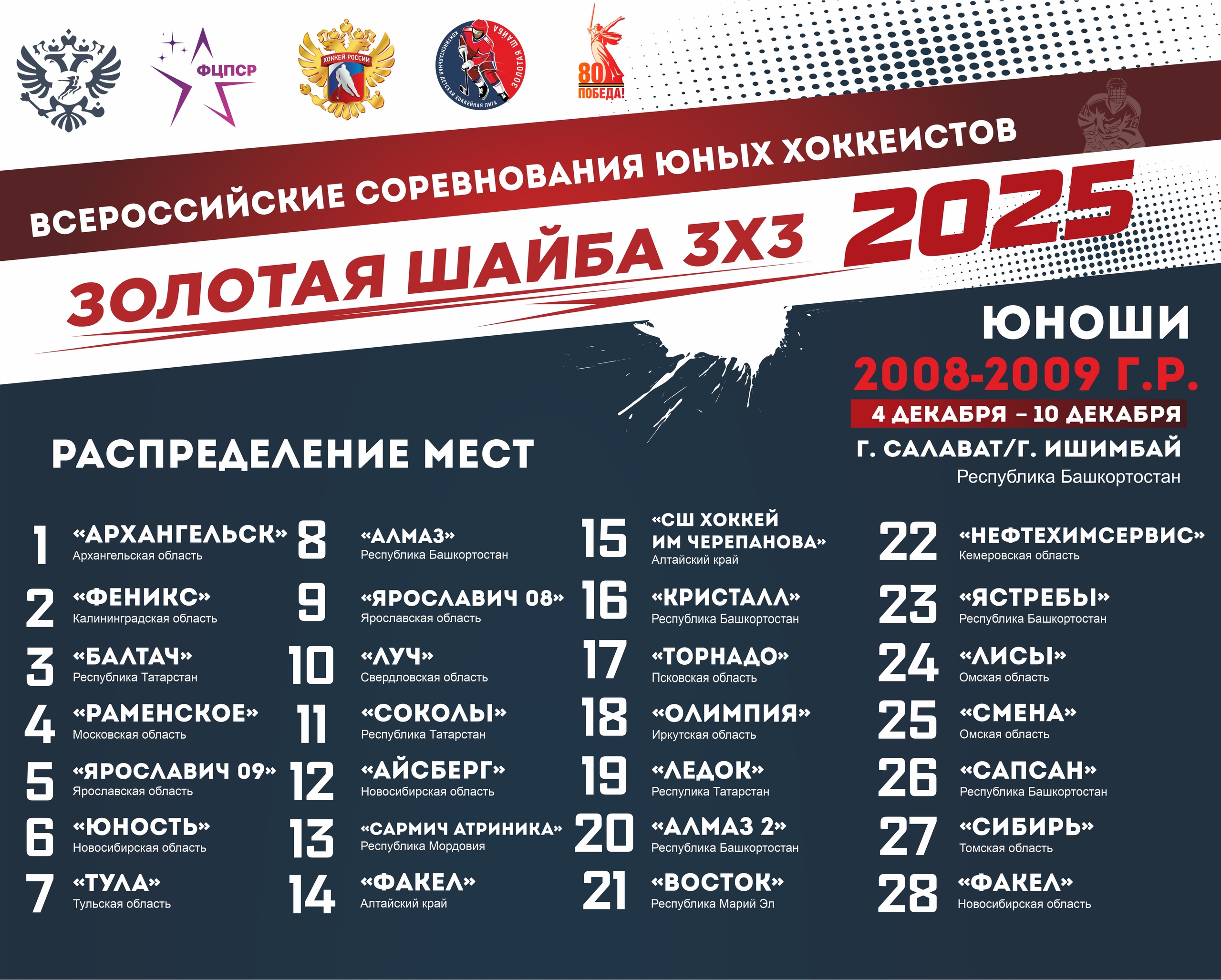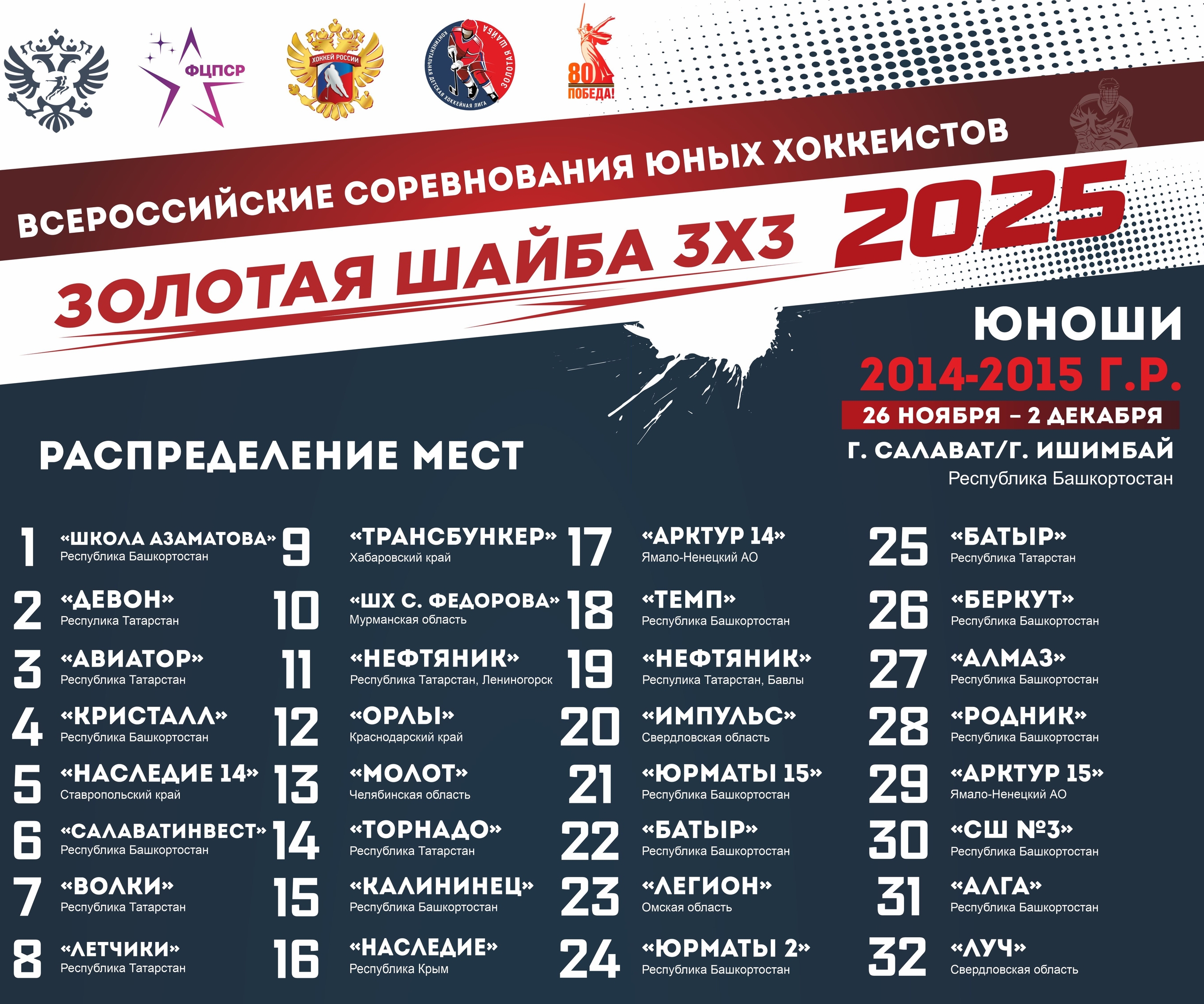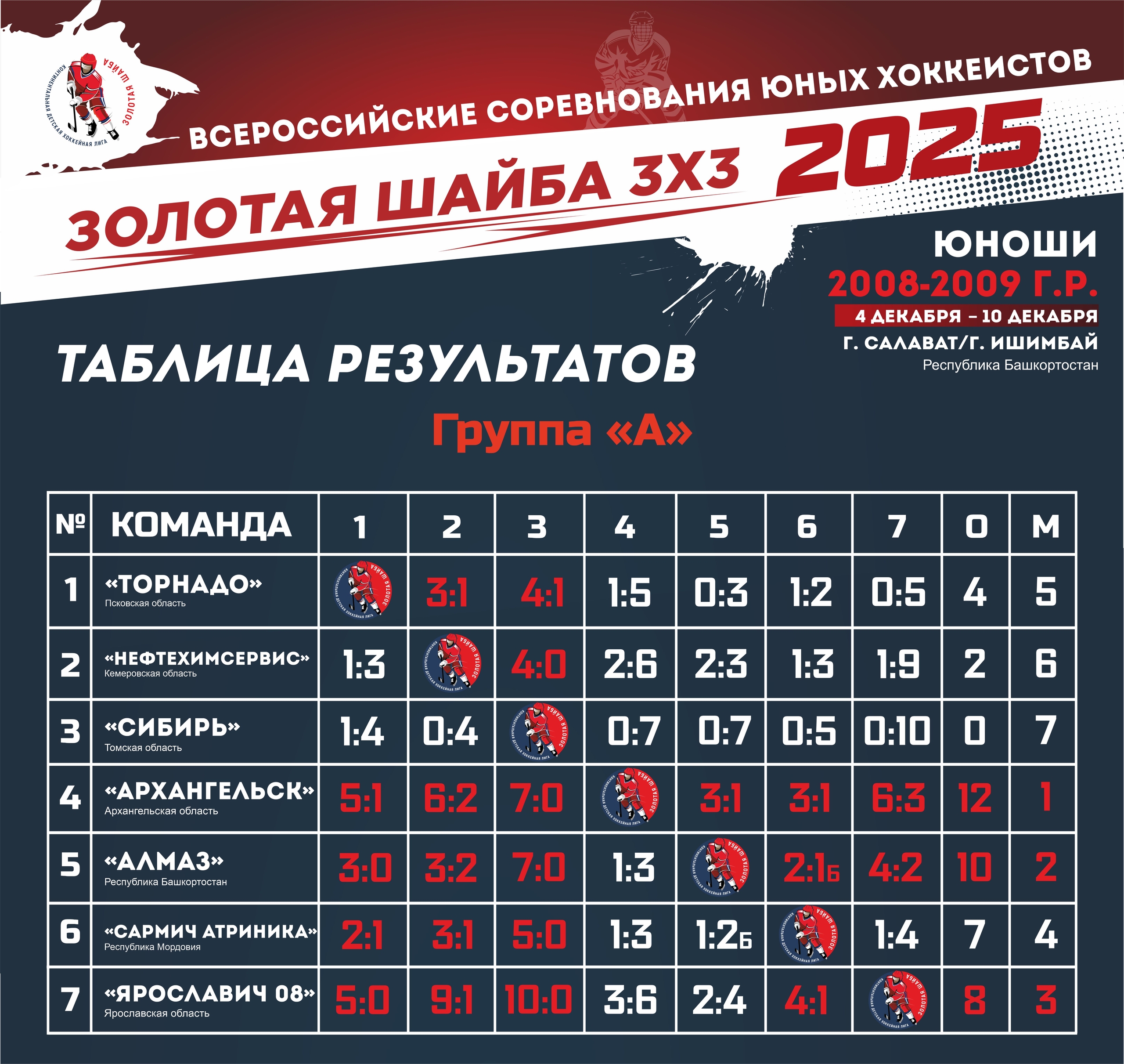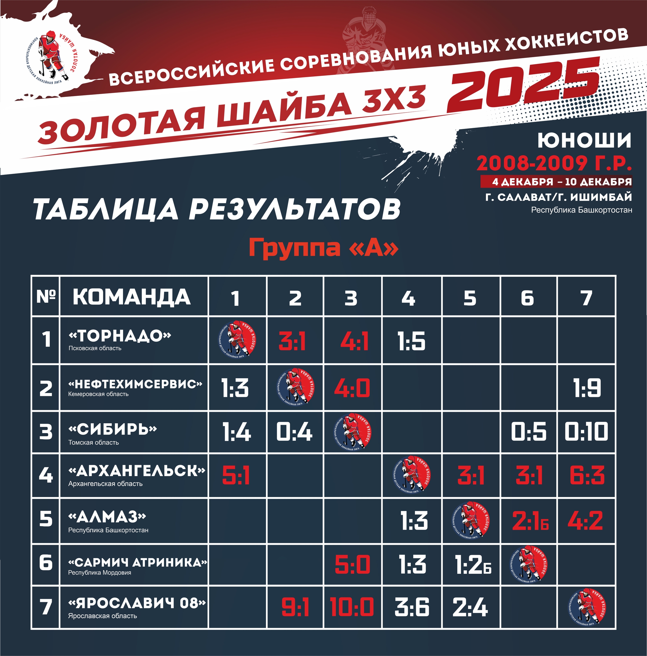 Расписание группового этапа Всероссийских соревнований юных хоккеистов «Золотая шайба 3х3» среди команд 2008-2009 годов рождения, которые пройдут в городах Салават и Ишимбай с 4 по 10 декабря