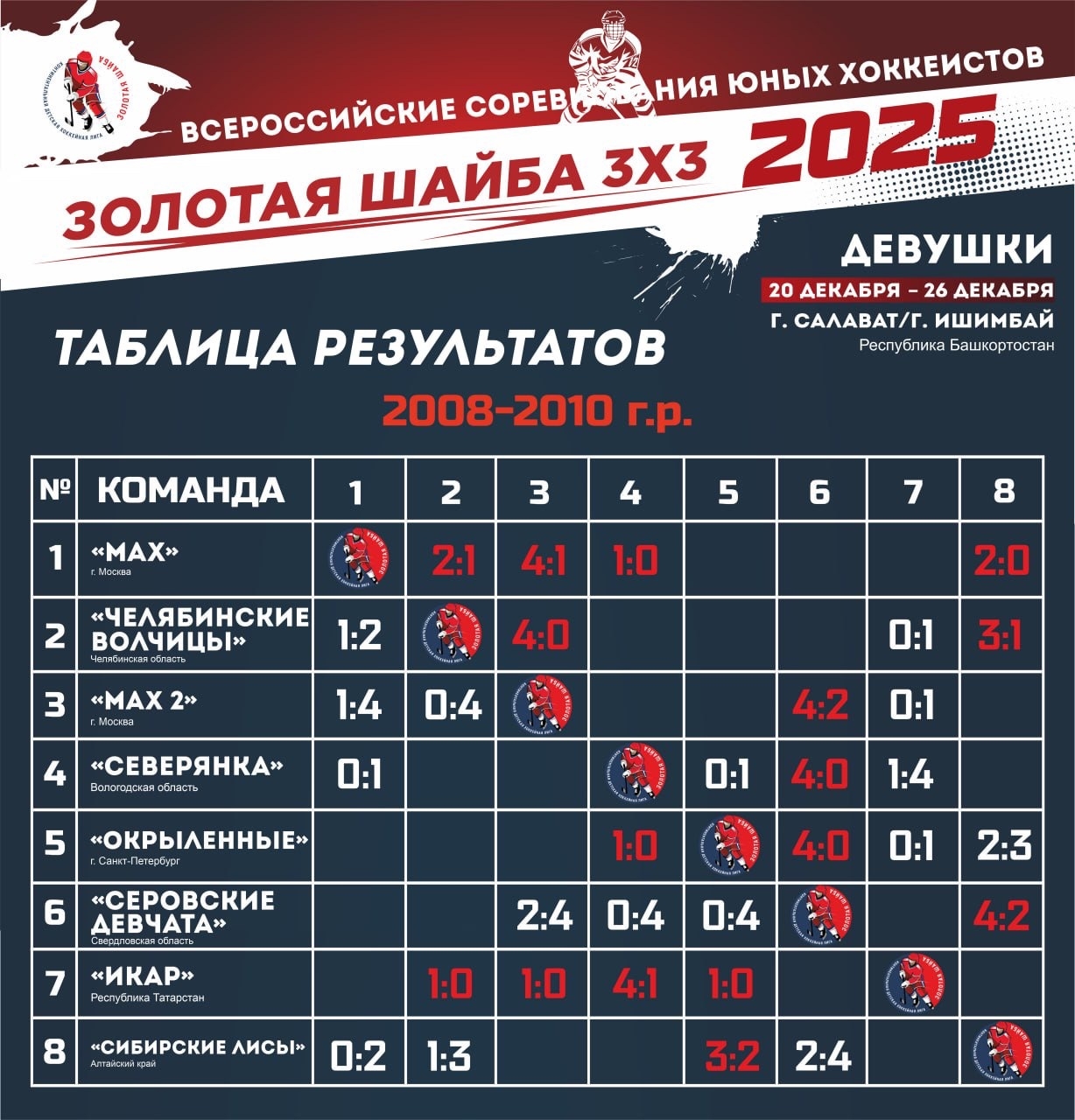 Таблицы результатов по итогу сегодняшних игр Всероссийских соревнований юных хоккеистов «Золотая шайба 3х3» среди команд девушек