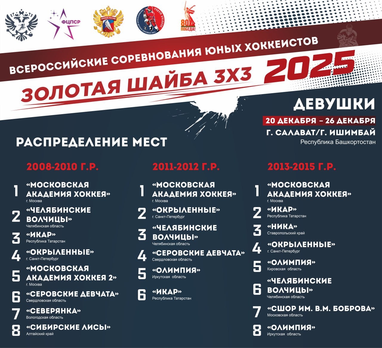 Расписание Всероссийских соревнований юных хоккеистов «Золотая шайба 3х3» среди команд девушек, которые пройдут в городах Салават и Ишимбай с 20 по 26 декабря