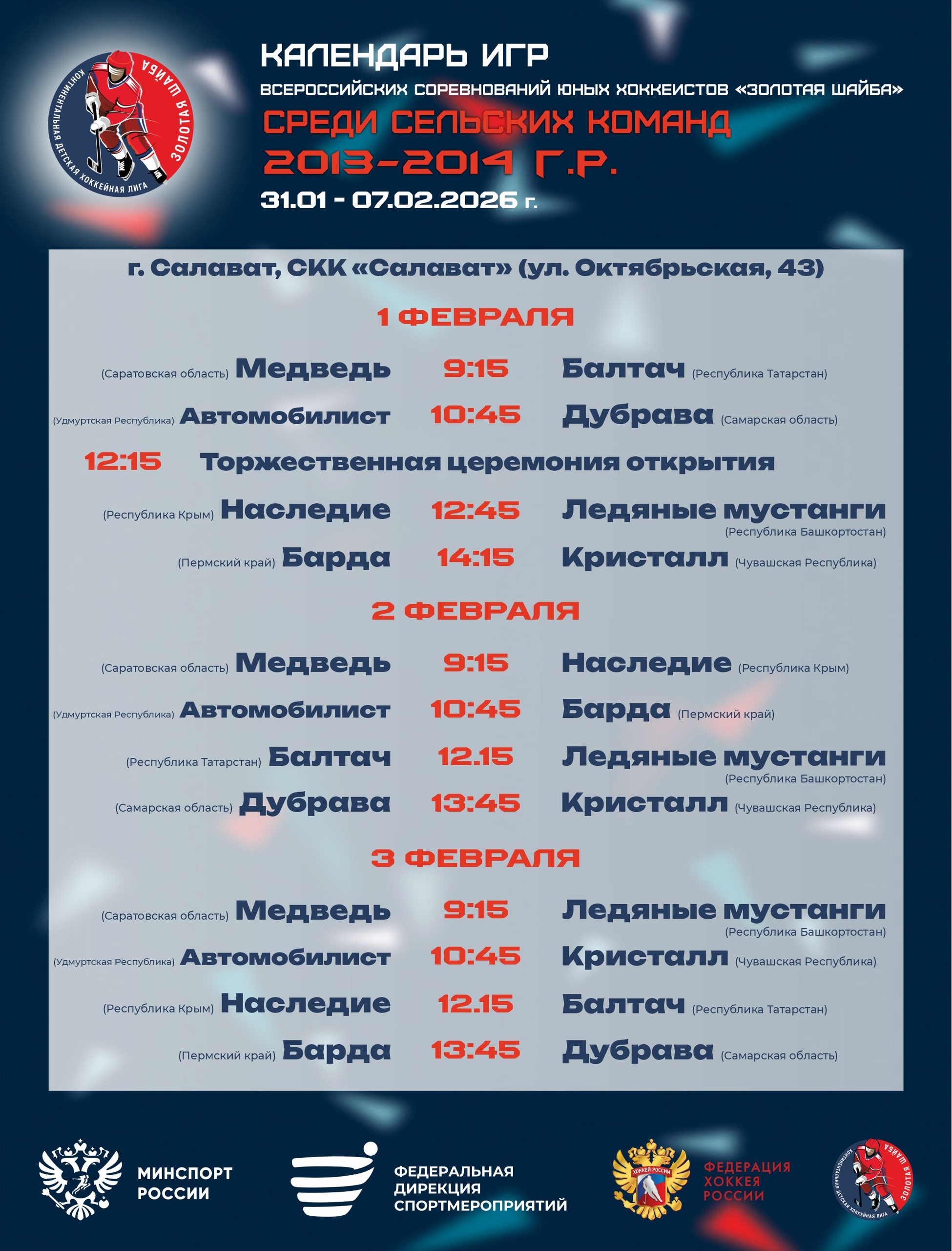 ➡ Календарь игр группового этапа Всероссийских финальных соревнований юных хоккеистов «Золотая шайба» среди сельских команд 2013-2014 г.р.