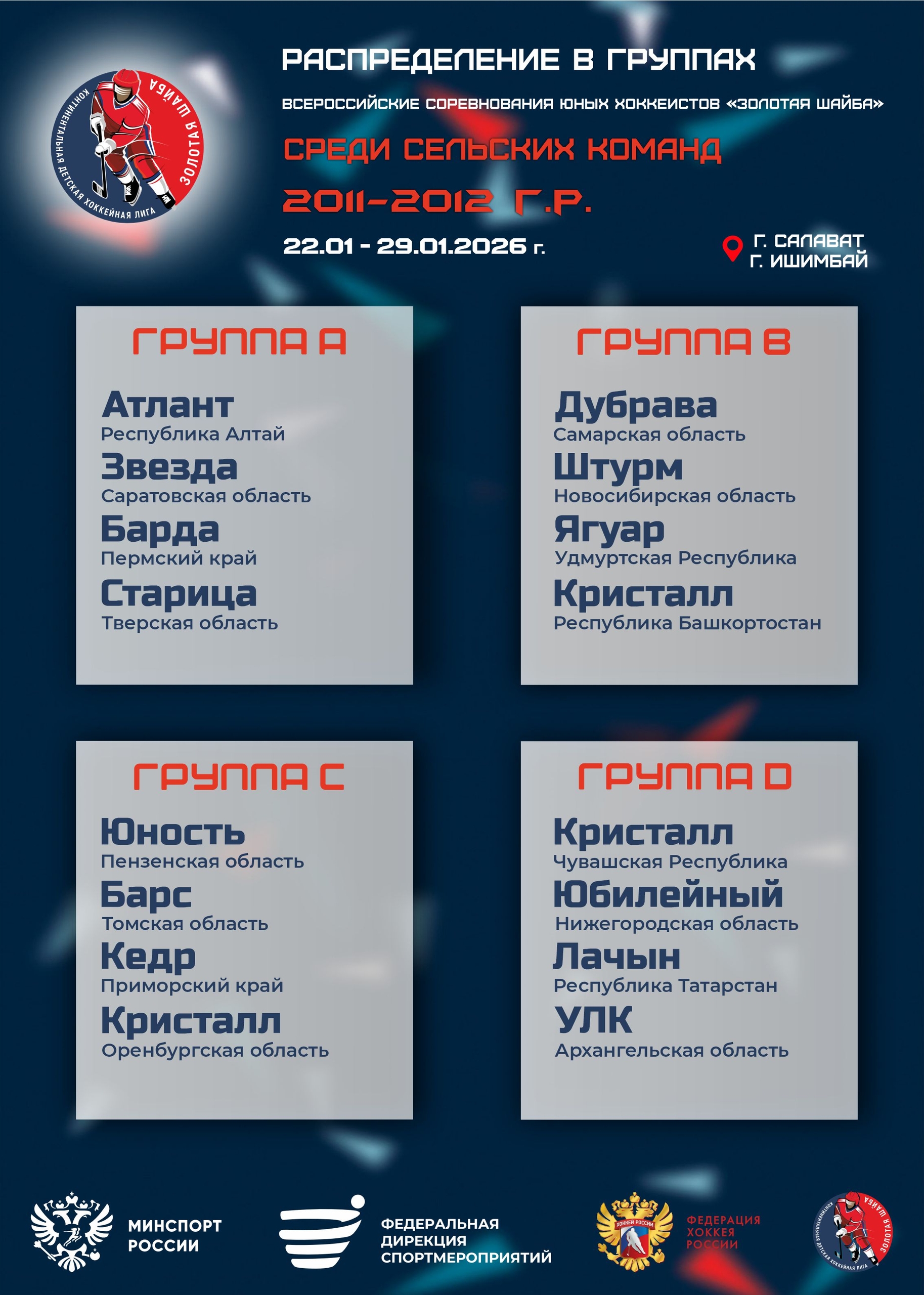 Распределение команд в группах на Всероссийских финальных соревнованиях юных хоккеистов «Золотая шайба» среди сельских команд 2011-2012 г.р., Республика Башкортостан