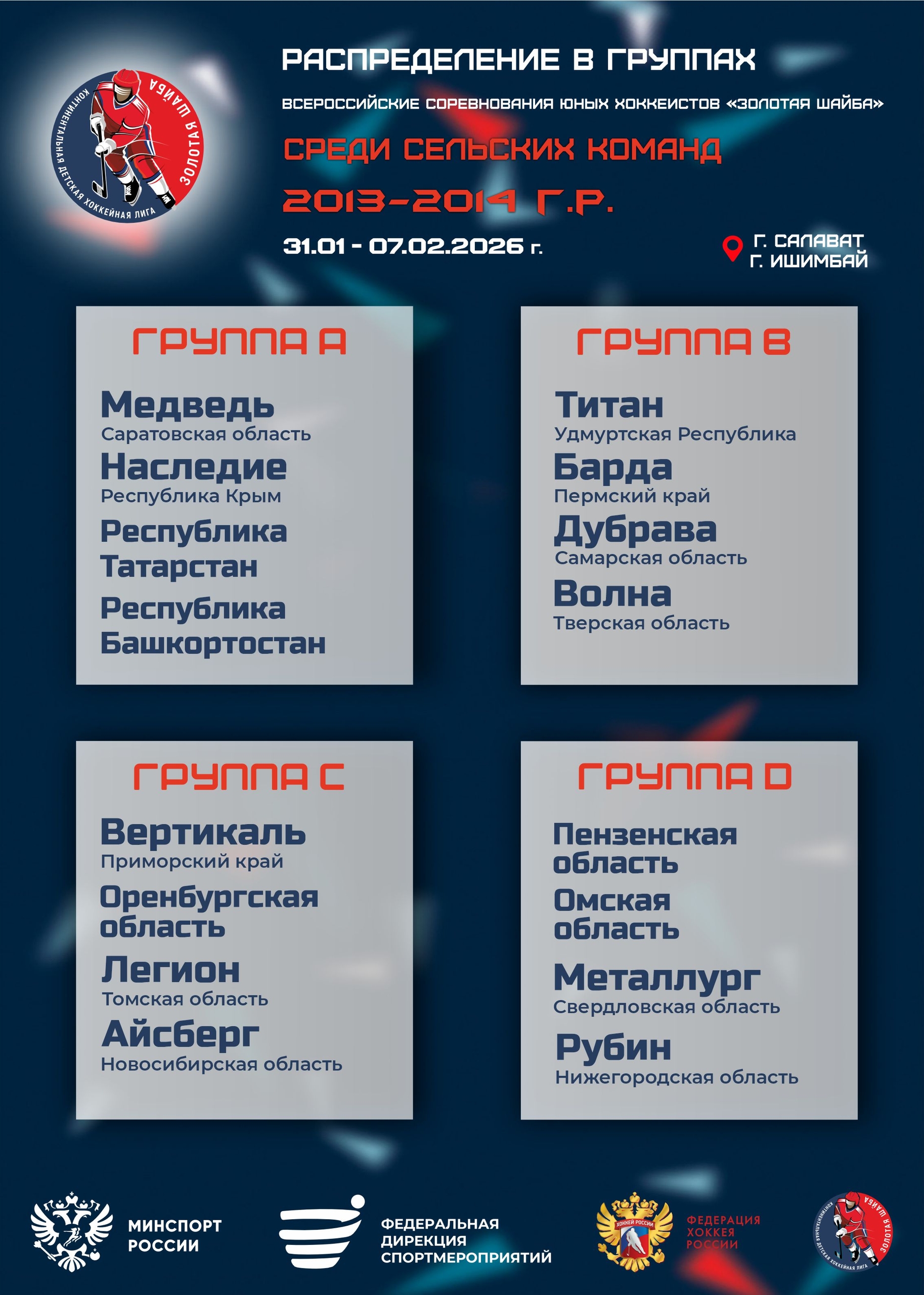 Распределение команд в группах на Всероссийских финальных соревнованиях юных хоккеистов «Золотая шайба» среди сельских команд 2013-2014 г.р., Республика Башкортостан