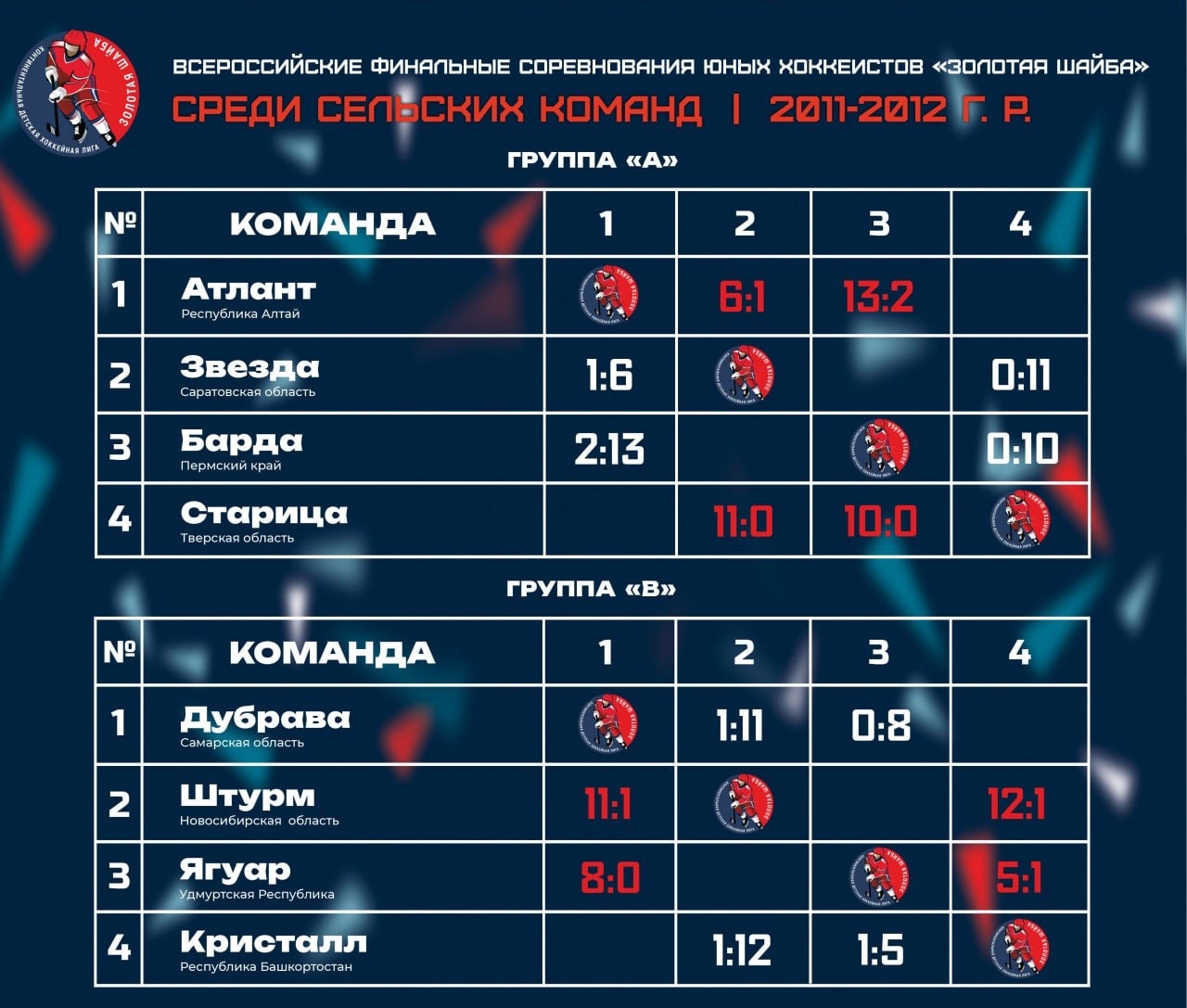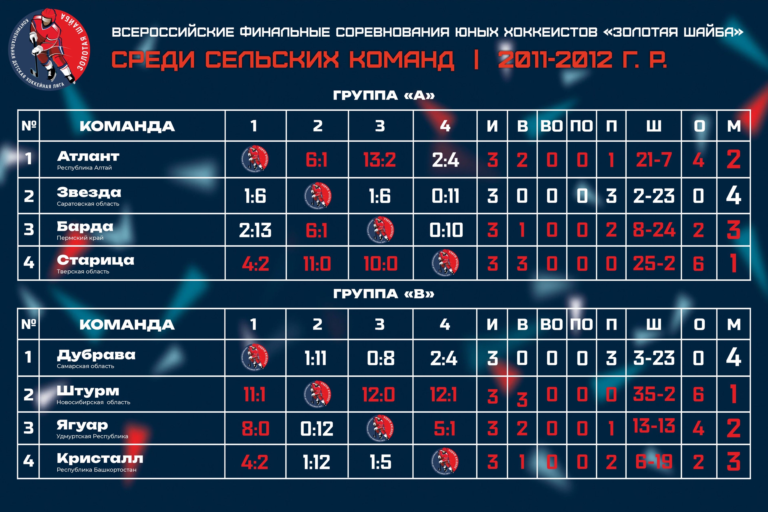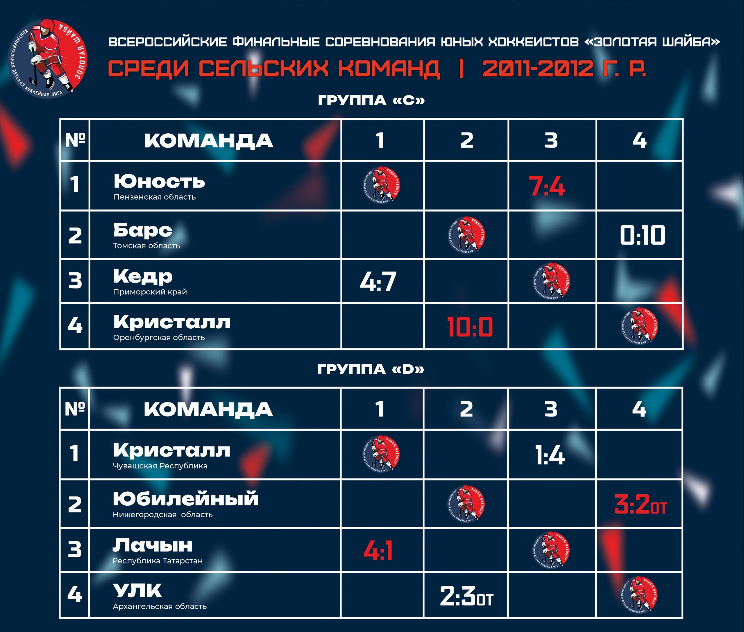 ✔️ Результаты по итогам двух игровых дней Всероссийских соревнований юных хоккеистов «Золотая шайба» среди сельских команд 2011-2012 гр