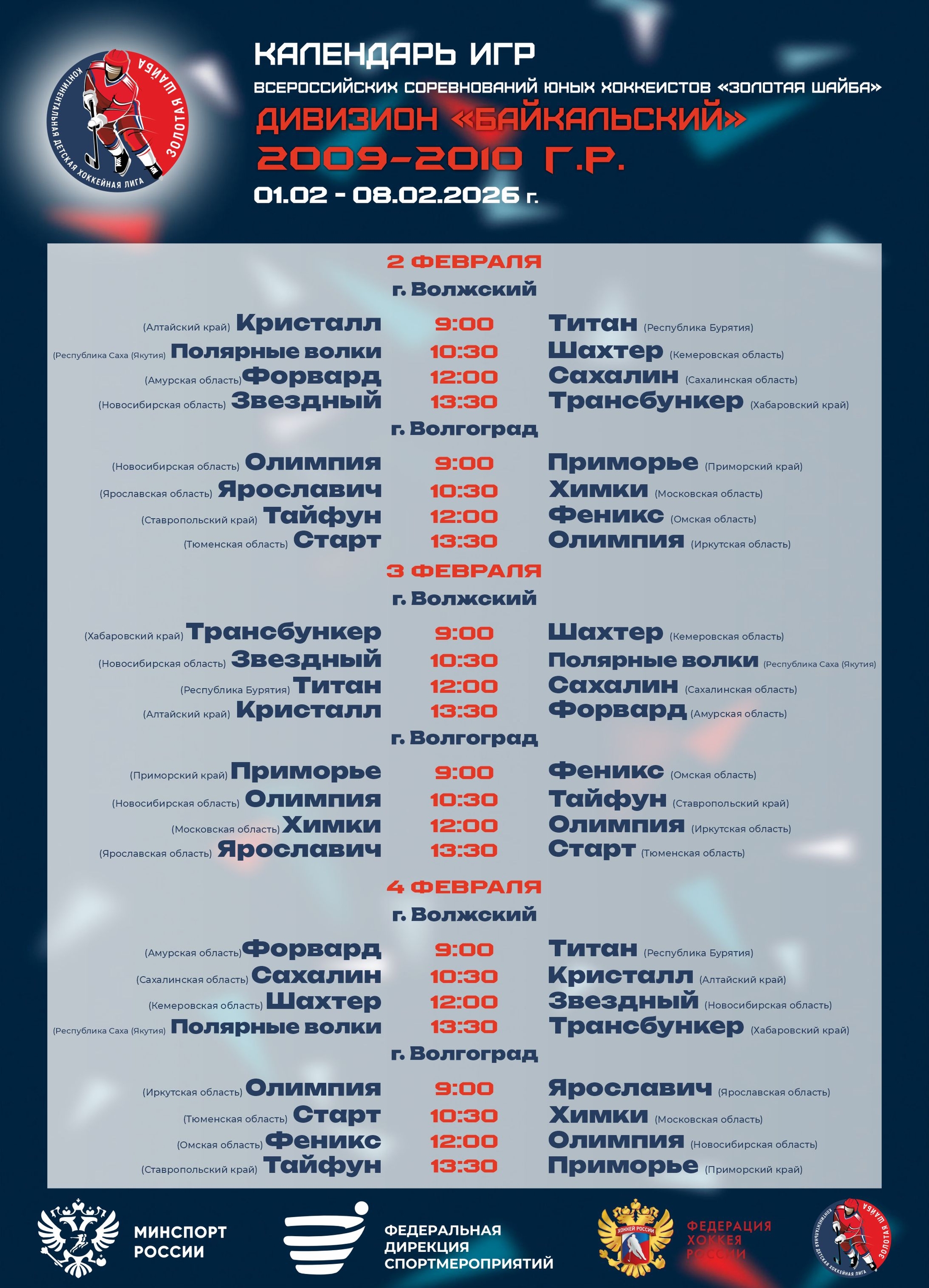Календарь игр группового этапа Всероссийских финальных соревнований юных хоккеистов «Золотая шайба» среди команд 2009-2010 г.р., дивизион «Байкальский» г. Волгоград/г. Волжский, Волгоградская область