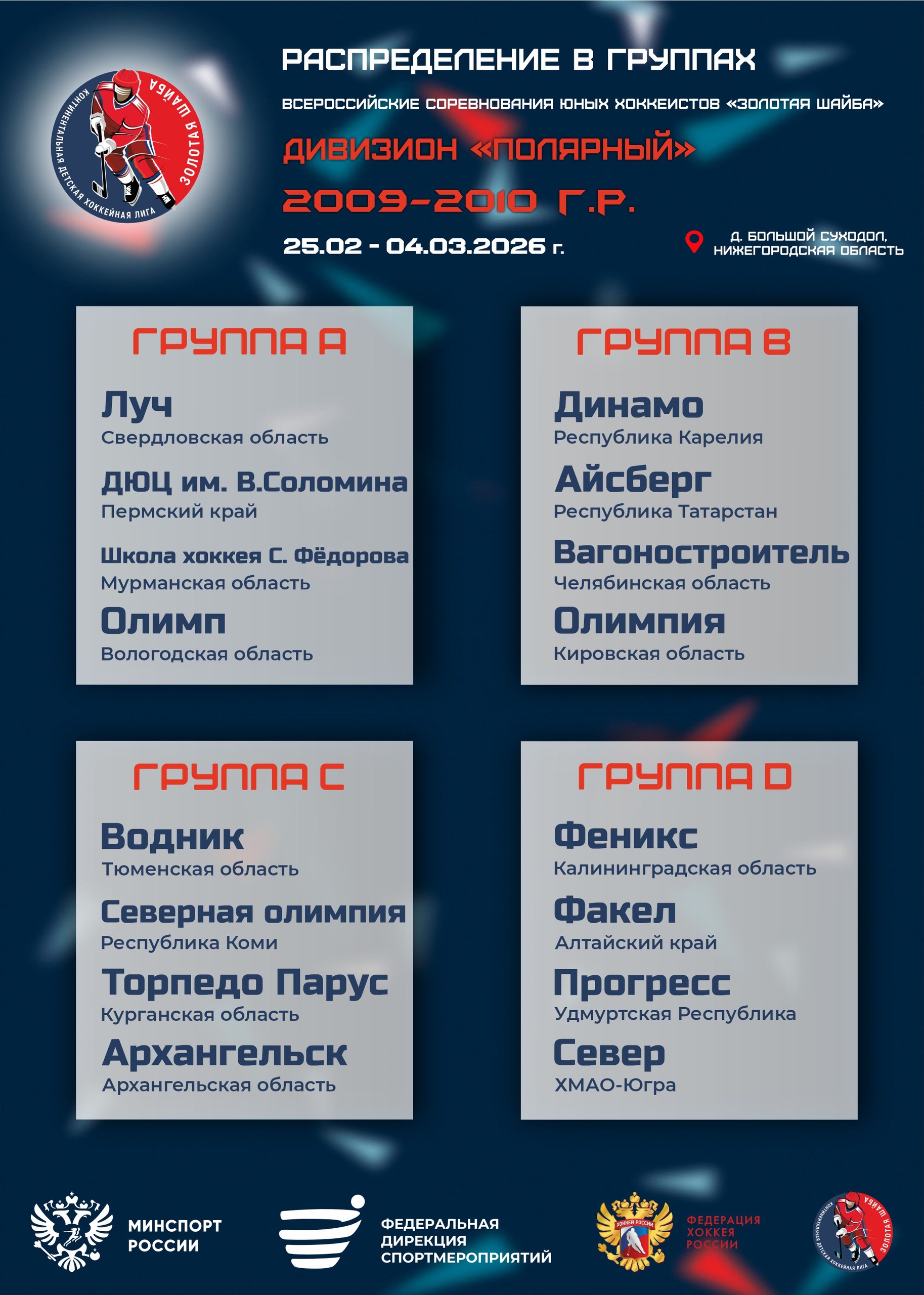 Распределение команд в группах на Всероссийских финальных соревнованиях юных хоккеистов «Золотая шайба» среди команд 2009-2010 г.р., дивизион «Полярный»